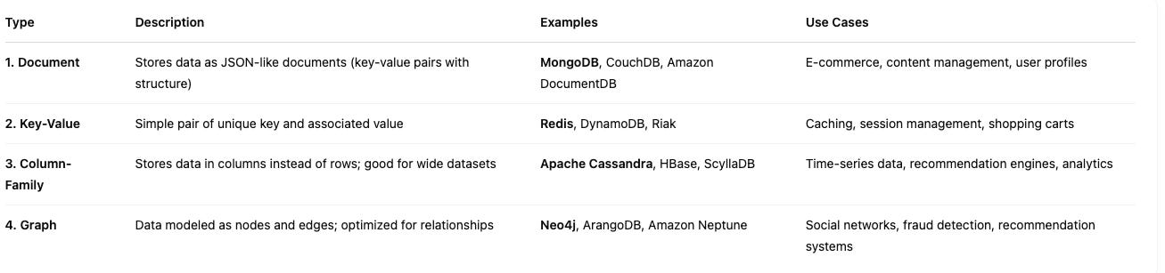 Read about the types of NoSQL databases: Key-Value, Document, Column-Family, and Graph databases.